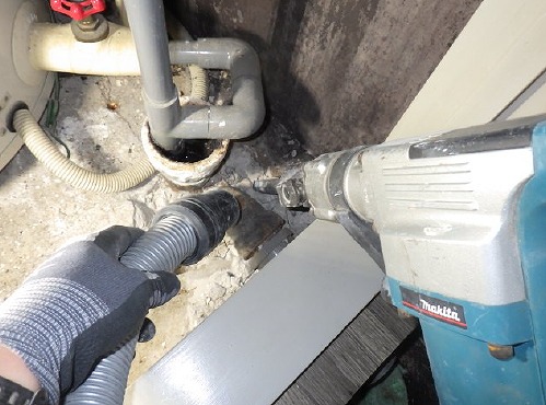 既設配管の取り出しに伴い、床スラブのハツリ施工を行いながら慎重に作業を進めます。